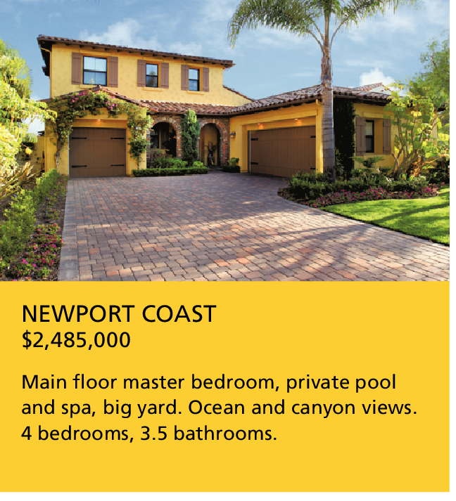 NEWPORT COAST $2,485,000 Main floor master bedroom, private pool and spa, big yard. Ocean and canyon views. 4 bedrooms, 3.5 bathrooms. See alsoNewport Beach > $3,100,000 Rick Langevin 949.933.2777Ask The BuilderNEWPORT MARINA VILLAS 4453 West Coast Highway $795,000 or Lease RANCHO SAN JOAQUIN 8 Montanas Sud >...NEWPORT COAST 23 Via Diamante > $2,990,000 or $11,500/mo.NEWPORT COAST 11 Splendore Drive >...NEWPORT COAST $2,999,000 or $12,000/mo.NEWPORT COAST $4,650,000 Tuscan...OPEN HOUSE SUN 1 - 4