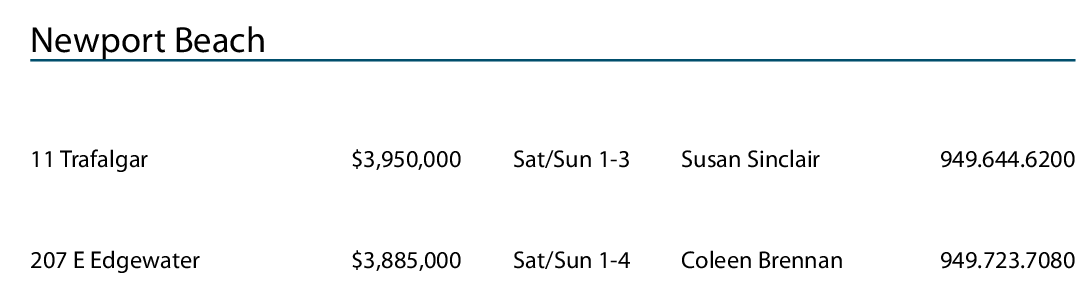 11 Trafalgar $3,950,000 Sat/Sun 1-3 Susan Sinclair 949.644.6200