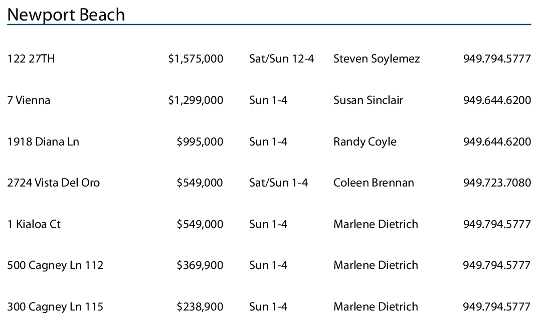 Newport Beach 122 27TH $1,575,000 Sat/Sun 12-4 Steven Soylemez 949.794.5777 7 Vienna $1,299,000 Sun 1-4 Susan Sinclair 949.644.6200 1918 Diana Ln $995,000 Sun 1-4 Randy Coyle 949.644.6200 2724 Vista Del Oro $549,000 Sat/Sun 1-4 Coleen Brennan 949.723.7080 1 Kialoa Ct $549,000 Sun 1-4 Marlene Dietrich 949.794.5777 500 Cagney Ln 112 $369,900 Sun 1-4 Marlene Dietrich 949.794.5777 300 Cagney Ln 115 $238,900 Sun 1-4 Marlene Dietrich 949.794.5777 See also