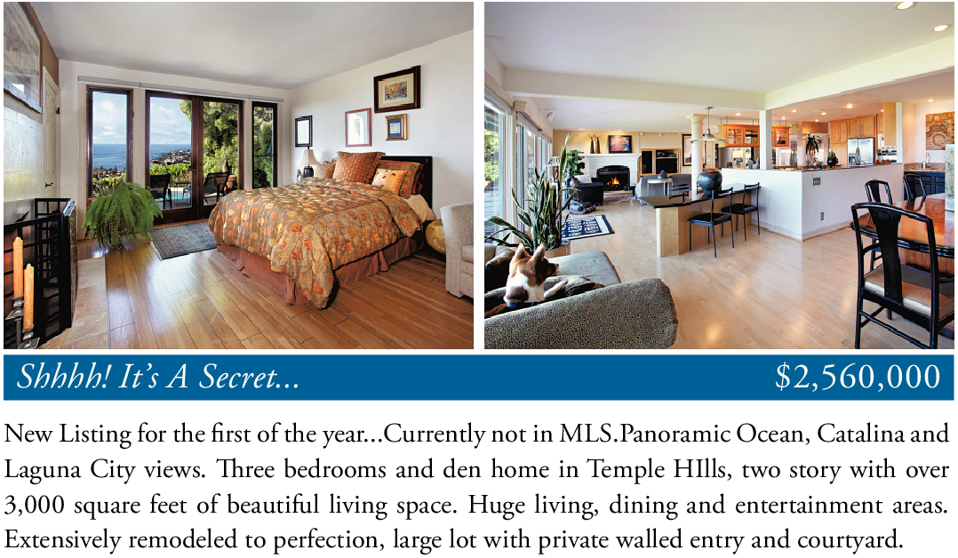 New Listing for the first of the year...Currently not in MLS.Panoramic Ocean, Catalina and Laguna City views. Three bedrooms and den home in Temple HIlls, two story with over 3,000 square feet of beautiful living space. Huge living, dining and entertainment areas. Extensively remodeled to perfection, large lot with private walled entry and courtyard.