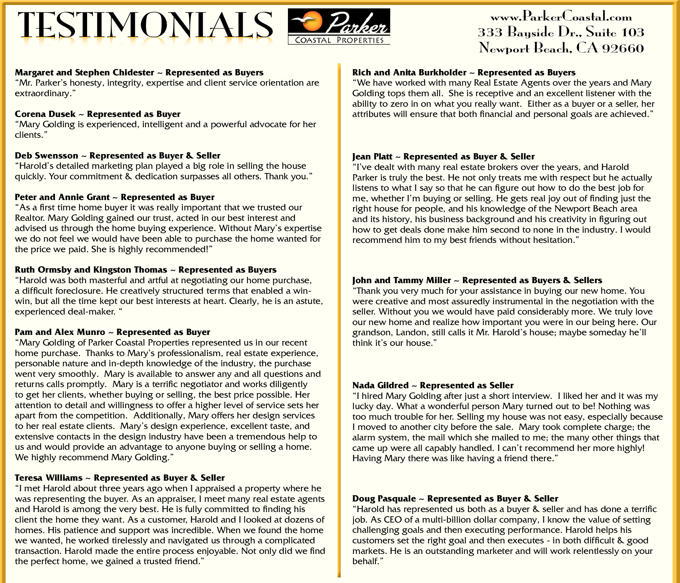 Jean Platt ~ Represented as Buyer & Seller “I’ve dealt with many real estate brokers over the years, and Harold Parker is truly the best. He not only treats me with respect but he actually listens to what I say so that he can figure out how to do the best job for me, whether I’m buying or selling. He gets real joy out of finding just the right house for people, and his knowledge of the Newport Beach area and its history, his business background and his creativity in figuring out how to get deals done make him second to none in the industry. I would recommend him to my best friends without hesitation.”