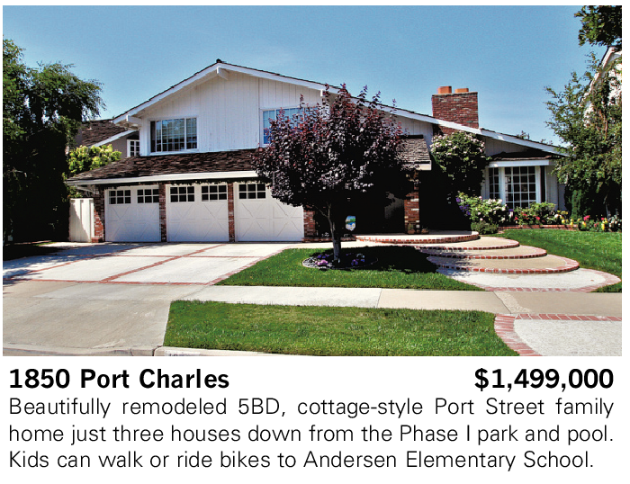 1850 Port Charles $1,499,000 Beautifully remodeled 5BD, cottage-style Port Street family home just three houses down from the Phase I park and pool. Kids can walk or ride bikes to Andersen Elementary School.
