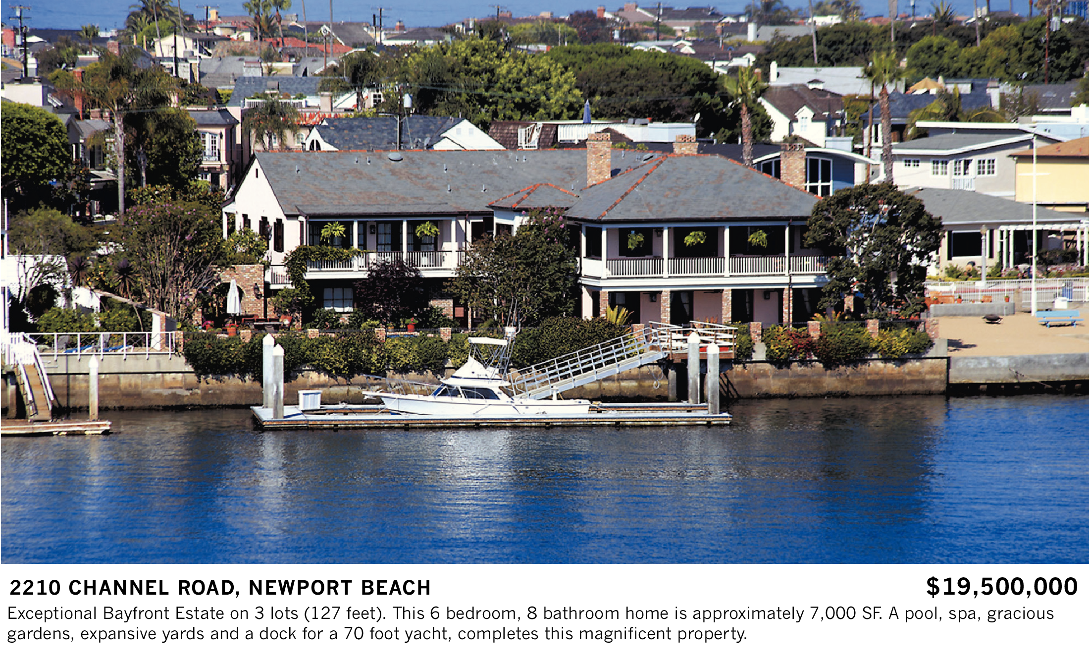 2210 CHANNEL ROAD, NEWPORT BEACH $19,500,000 Exceptional Bayfront Estate on 3 lots (127 feet). This 6 bedroom, 8 bathroom home is approximately 7,000 SF. A pool, spa, gracious gardens, expansive yards and a dock for a 70 foot yacht, completes this magnificent property.