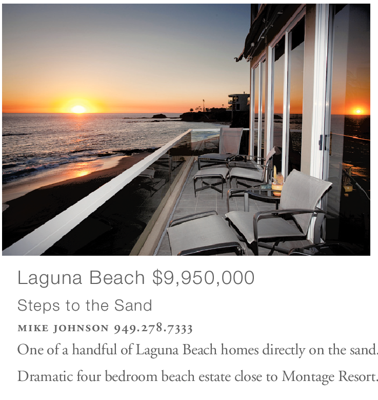 Laguna Beach $9,950,000 Steps to the Sand mike johnson 949.278.7333 One of a handful of Laguna Beach homes directly on the sand. Dramatic four bedroom beach estate close to Montage Resort.