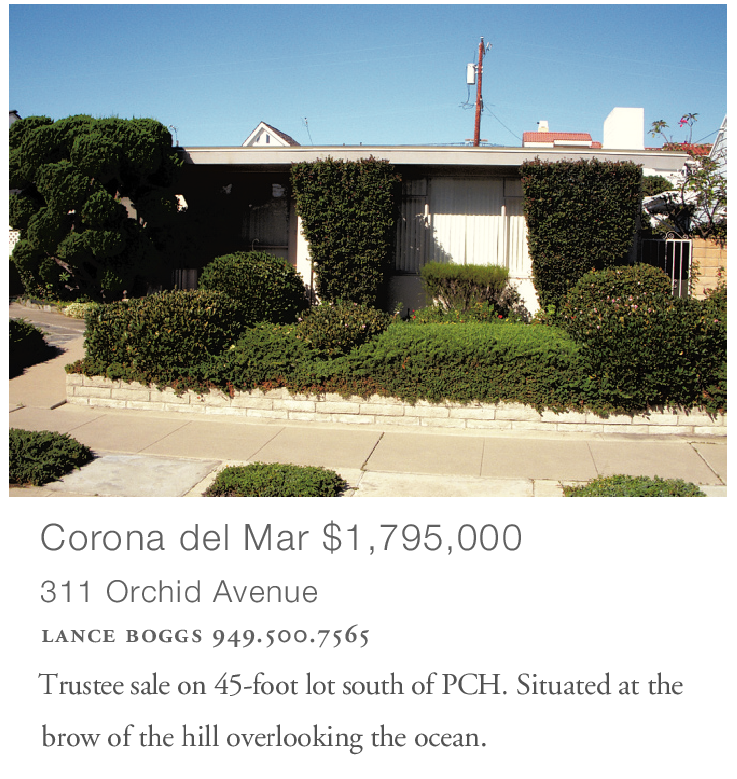 Corona del Mar $1,795,000 311 Orchid Avenue lance boggs 949.500.7565 Trustee sale on 45-foot lot south of PCH. Situated at the brow of the hill overlooking the ocean.