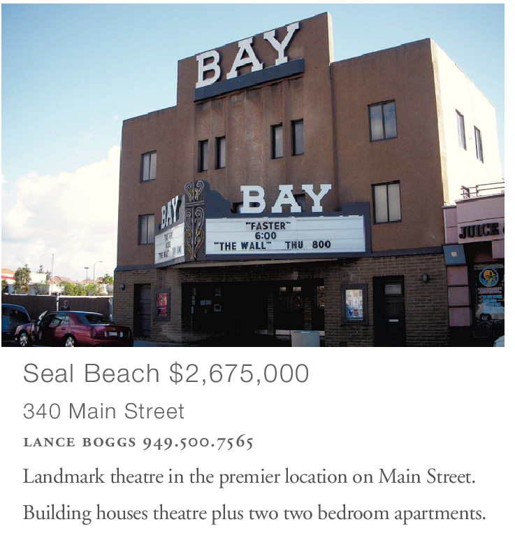 Seal Beach $2,675,000 340 Main Street lance boggs 949.500.7565 Landmark theatre in the premier location on Main Street. Building houses theatre plus two two bedroom apartments.