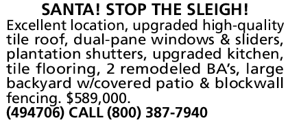 Excellent location, upgraded high-quality tile roof, dual-pane windows & sliders, plantation shutters, upgraded kitchen, tile flooring, 2 remodeled BA’s, large backyard w/covered patio & blockwall fencing. $589,000. (494706) CALL (800) 387-7940