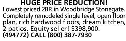 Lowest priced 2BR in Woodbridge Stonegate. Completely remodeled single level, open floor plan, rich hardwood floors, dream kitchen, 2 patios. Equity seller! $398,900. (494772) CALL (800) 387-7930