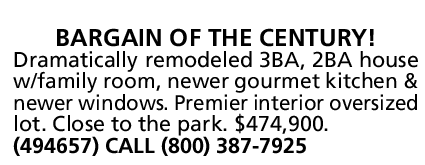 Dramatically remodeled 3BA, 2BA house w/family room, newer gourmet kitchen & newer windows. Premier interior oversized lot. Close to the park. $474,900. (494657) CALL (800) 387-7925