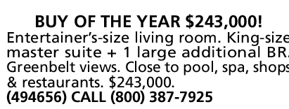 Entertainer’s-size living room. King-size master suite + 1 large additional BR. Greenbelt views. Close to pool, spa, shops & restaurants. $243,000. (494656) CALL (800) 387-7925