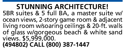 5BR suites & 5 full BA, a master suite w/ ocean views, 2-story game room & adjacent living room w/soaring ceilings & 20-ft. walls of glass w/gorgeous beach & white sand views. $5,999,000. (494802) CALL (800) 387-1447