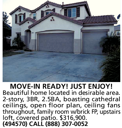 Beautiful home located in desirable area. 2-story, 3BR, 2.5BA, boasting cathedral ceilings, open floor plan, ceiling fans throughout, family room w/brick FP, upstairs loft, covered patio. $316,900. (494570) CALL (888) 307-0052