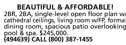 2BR, 2BA, single-level open floor plan w/ cathedral ceilings, living room w/FP, formal dining room, spacious patio overlooking pool & spa. $245,000. (494639) CALL (800) 387-1455