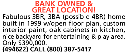 Fabulous 3BR, 3BA (possible 4BR) home built in 1999 w/open floor plan, custom interior paint, oak cabinets in kitchen, nice backyard for entertaining & play area. Only $390,000. (494622) CALL (800) 387-5417