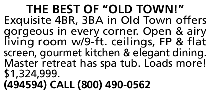 THE BEST OF “OLD TOWN!” Exquisite 4BR, 3BA in Old Town offers gorgeous in every corner. Open & airy living room w/9-ft. ceilings, FP & flat screen, gourmet kitchen & elegant dining. Master retreat has spa tub. Loads more! $1,324,999. (494594) CALL (800) 490-0562