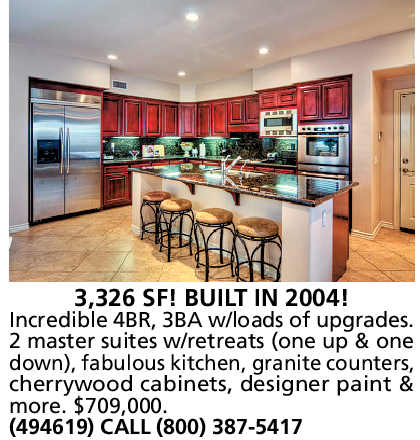 Incredible 4BR, 3BA w/loads of upgrades. 2 master suites w/retreats (one up & one down), fabulous kitchen, granite counters, cherrywood cabinets, designer paint & more. $709,000. (494619) CALL (800) 387-5417