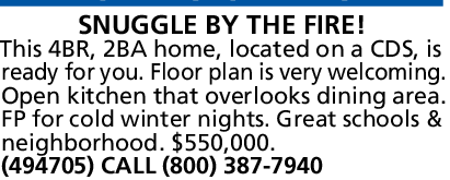 This 4BR, 2BA home, located on a CDS, is ready for you. Floor plan is very welcoming. Open kitchen that overlooks dining area. FP for cold winter nights. Great schools & neighborhood. $550,000. (494705) CALL (800) 387-7940