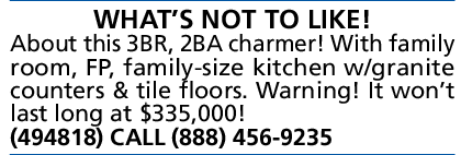 About this 3BR, 2BA charmer! With family room, FP, family-size kitchen w/granite counters & tile floors. Warning! It won’t last long at $335,000! (494818) CALL (888) 456-9235