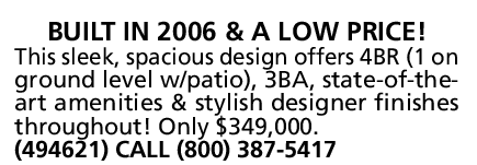 This sleek, spacious design offers 4BR (1 on ground level w/patio), 3BA, state-of-theart amenities & stylish designer finishes throughout! Only $349,000. (494621) CALL (800) 387-5417
