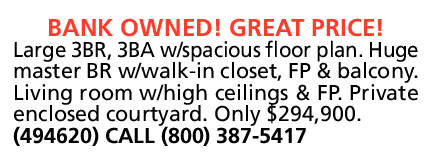 Large 3BR, 3BA w/spacious floor plan. Huge master BR w/walk-in closet, FP & balcony. Living room w/high ceilings & FP. Private enclosed courtyard. Only $294,900. (494620) CALL (800) 387-5417