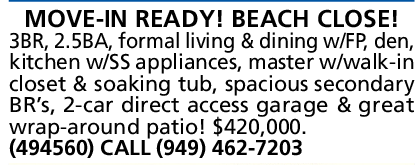 3BR, 2.5BA, formal living & dining w/FP, den, kitchen w/SS appliances, master w/walk-in closet & soaking tub, spacious secondary BR’s, 2-car direct access garage & great wrap-around patio! $420,000. (494560) CALL (949) 462-7203