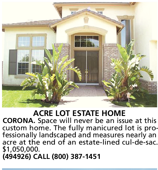 ACRE LOT ESTATE HOME CORONA. Space will never be an issue at this custom home. The fully manicured lot is professionally landscaped and measures nearly an acre at the end of an estate-lined cul-de-sac. $1,050,000.