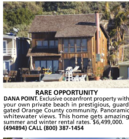 RARE OPPORTUNITY DANA POINT. Exclusive oceanfront property with your own private beach in prestigious, guardgated Orange County community. Panoramic whitewater views. This home gets amazing summer and winter rental rates. $6,499,000. (494894) CALL (800) 387-1454