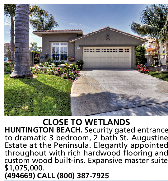 CLOSE TO WETLANDS HUNTINGTON BEACH. Security gated entrance to dramatic 3 bedroom, 2 bath St. Augustine Estate at the Peninsula. Elegantly appointed throughout with rich hardwood flooring and custom wood built-ins. Expansive master suite. $1,075,000.