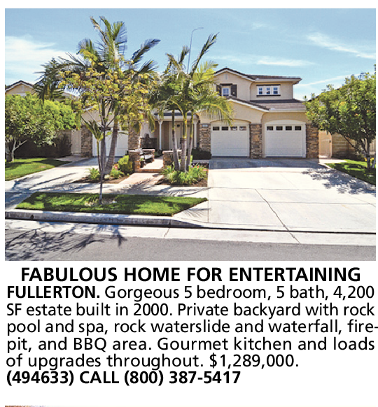 FABULOUS HOME FOR ENTERTAINING FULLERTON. Gorgeous 5 bedroom, 5 bath, 4,200 SF estate built in 2000. Private backyard with rock pool and spa, rock waterslide and waterfall, firepit, and BBQ area. Gourmet kitchen and loads of upgrades throughout. $1,289,000.