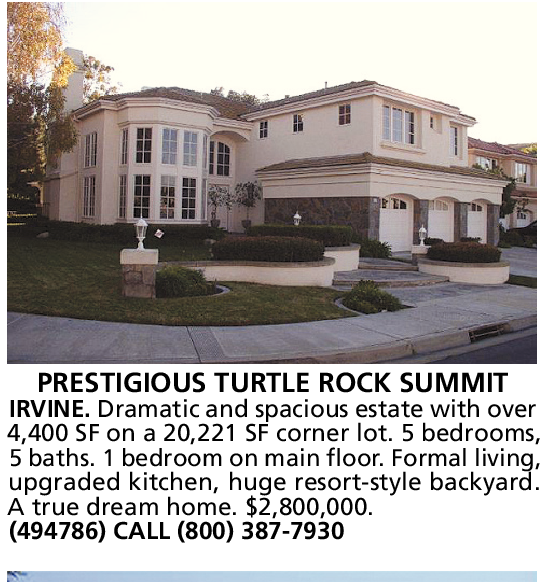 PRESTIGIOUS TURTLE ROCK SUMMIT IRVINE. Dramatic and spacious estate with over 4,400 SF on a 20,221 SF corner lot. 5 bedrooms, 5 baths. 1 bedroom on main floor. Formal living, upgraded kitchen, huge resort-style backyard. A true dream home. $2,800,000. (494786) CALL (800) 387-7930