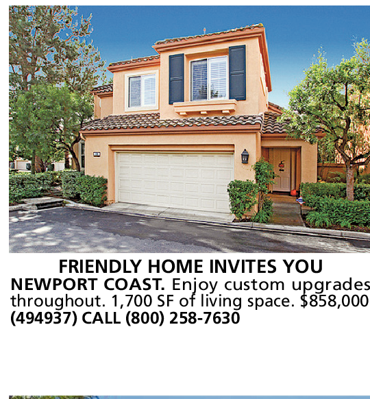 FRIENDLY HOME INVITES YOU NEWPORT COAST. Enjoy custom upgrades throughout. 1,700 SF of living space. $858,000. (494937) CALL (800) 258-7630