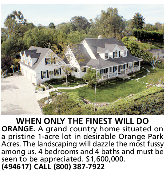 WHEN ONLY THE FINEST WILL DO ORANGE. A grand country home situated on a pristine 1-acre lot in desirable Orange Park Acres. The landscaping will dazzle the most fussy among us. 4 bedrooms and 4 baths and must be seen to be appreciated. $1,600,000. (494617) CALL (800) 387-7922