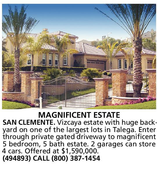MAGNIFICENT ESTATE SAN CLEMENTE. Vizcaya estate with huge backyard on one of the largest lots in Talega. Enter through private gated driveway to magnificent 5 bedroom, 5 bath estate. 2 garages can store 4 cars. Offered at $1,590,000.