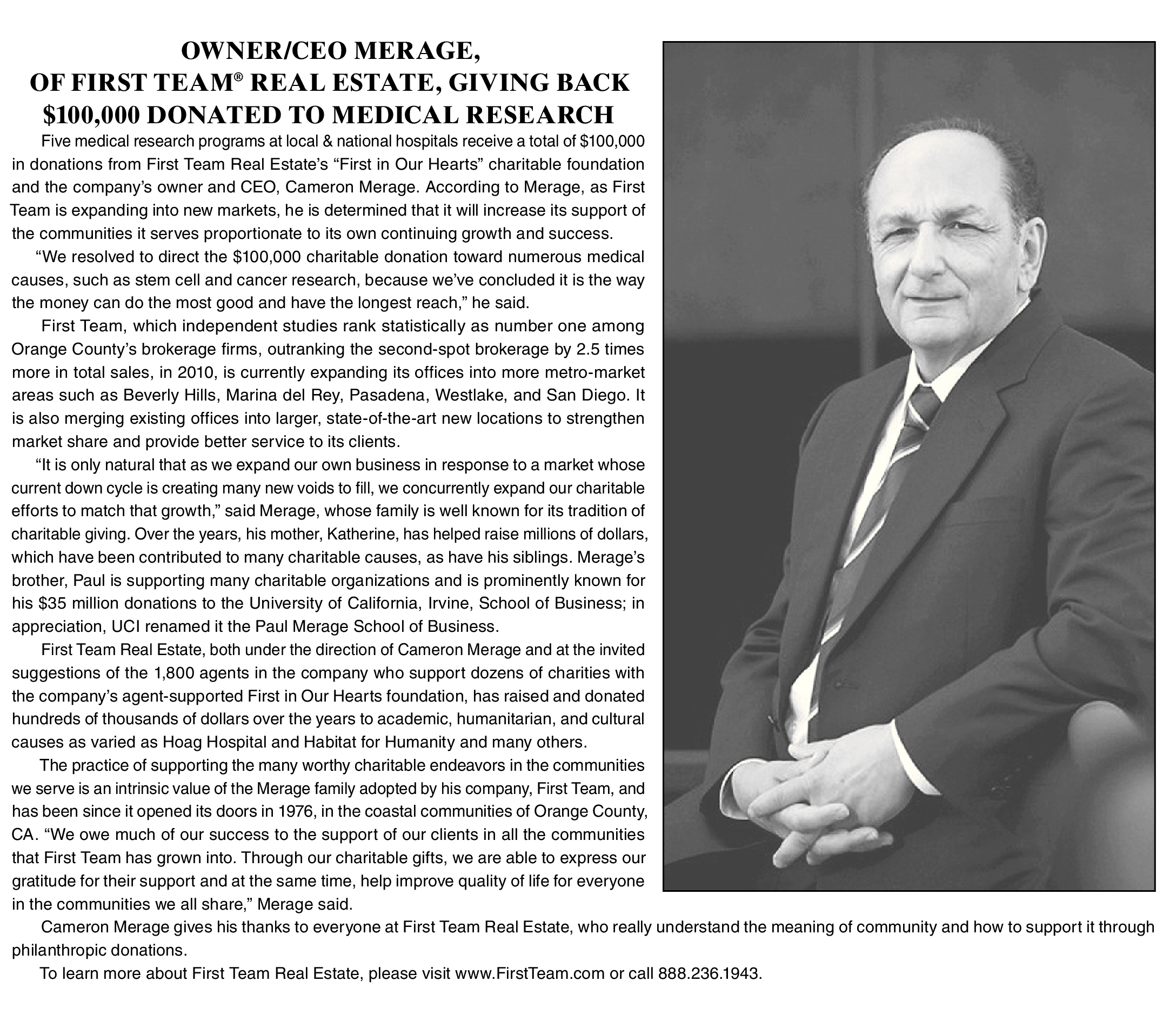 Five medical research programs at local & national hospitals receive a total of $100,000 in donations from First Team Real Estate’s “First in Our Hearts” charitable foundation and the company’s owner and CEO, Cameron Merage. According to Merage, as First Team is expanding into new markets, he is determined that it will increase its support of the communities it serves proportionate to its own continuing growth and success.