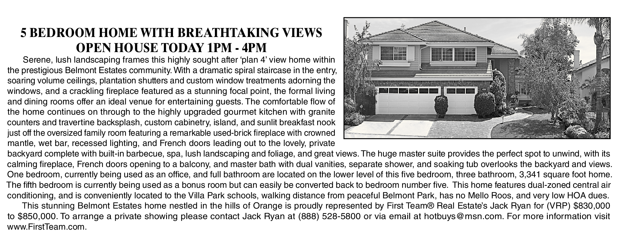 This stunning Belmont Estates home nestled in the hills of Orange is proudly represented by First Team® Real Estate’s Jack Ryan for (VRP) $830,000 to $850,000. To arrange a private showing please contact Jack Ryan at (888) 528-5800 or via email at hotbuys@msn.com. For more information visit www.FirstTeam.com.