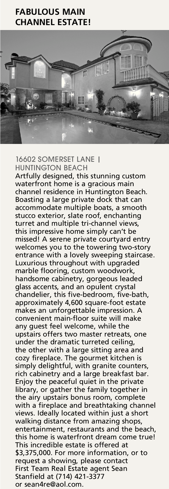 FABULOUS MAIN CHANNEL ESTATE! 16602 SOMERSET LANE | HUNTINGTON BEACH Artfully designed, this stunning custom waterfront home is a gracious main channel residence in Huntington Beach. Boasting a large private dock that can accommodate multiple boats, a smooth stucco exterior, slate roof, enchanting turret and multiple tri-channel views, this impressive home simply can’t be missed! A serene private courtyard entry welcomes you to the towering two-story entrance with a lovely sweeping staircase. Luxurious throughout with upgraded marble flooring, custom woodwork, handsome cabinetry, gorgeous leaded glass accents, and an opulent crystal chandelier, this five-bedroom, five-bath, approximately 4,600 square-foot estate makes an unforgettable impression. A convenient main-floor suite will make any guest feel welcome, while the upstairs offers two master retreats, one under the dramatic turreted ceiling, the other with a large sitting area and cozy fireplace. The gourmet kitchen is simply delightful, with granite counters, rich cabinetry and a large breakfast bar. Enjoy the peaceful quiet in the private library, or gather the family together in the airy upstairs bonus room, complete with a fireplace and breathtaking channel views. Ideally located within just a short walking distance from amazing shops, entertainment, restaurants and the beach, this home is waterfront dream come true! This incredible estate is offered at $3,375,000. For more information, or to request a showing, please contact First Team Real Estate agent Sean Stanfield at (714) 421-3377 or sean4re@aol.com.