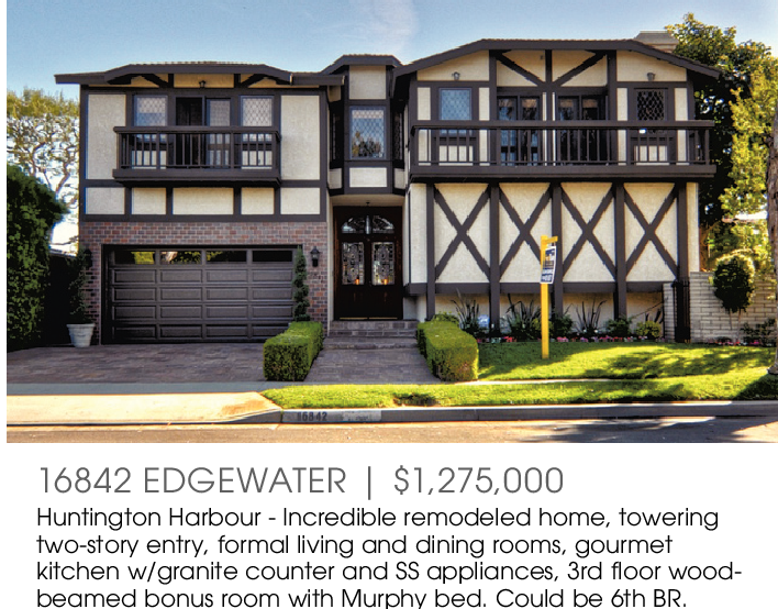 16842 EDGEWATER | $1,275,000 Huntington Harbour - Incredible remodeled home, towering two-story entry, formal living and dining rooms, gourmet kitchen w/granite counter and SS appliances, 3rd floor woodbeamed bonus room with Murphy bed. Could be 6th BR.