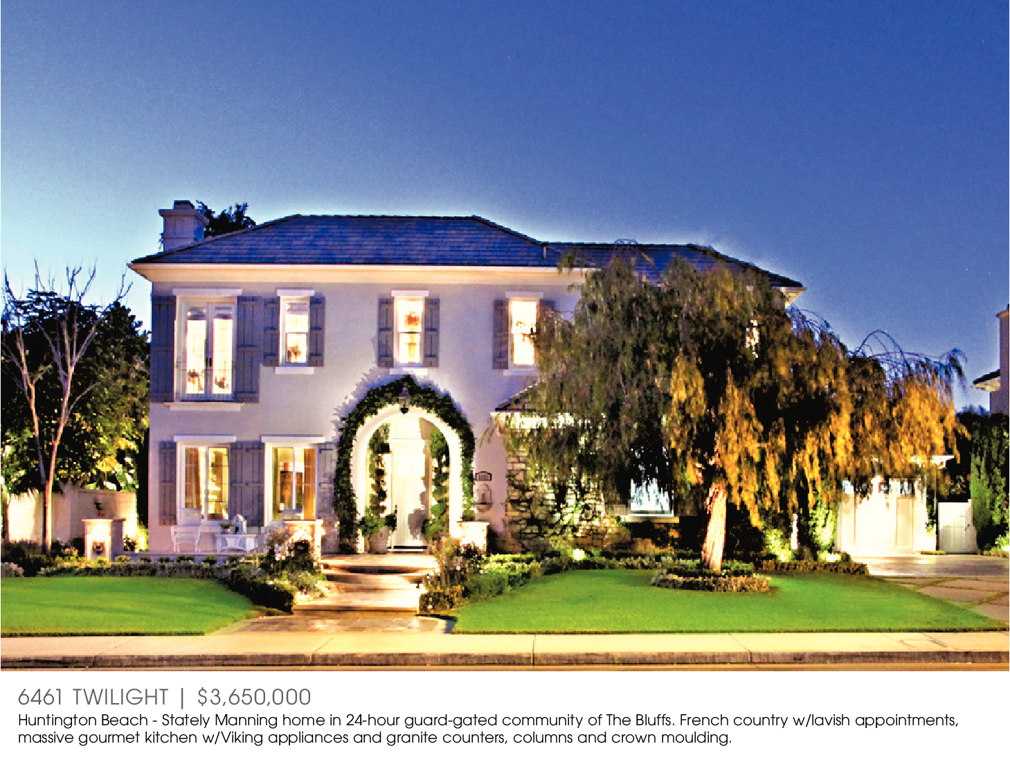 6461 TWILIGHT | $3,650,000 Huntington Beach - Stately Manning home in 24-hour guard-gated community of The Bluffs. French country w/lavish appointments, massive gourmet kitchen w/Viking appliances and granite counters, columns and crown moulding.