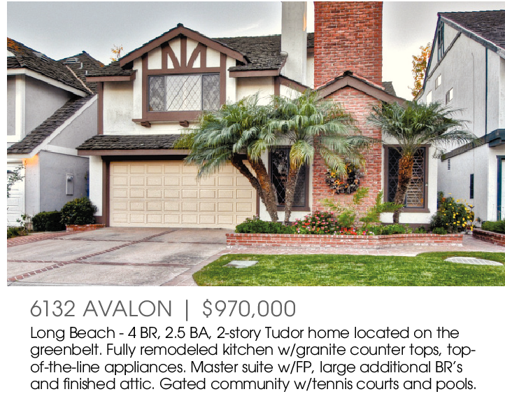 6132 AVALON | $970,000 Long Beach -4BR,2.5BA,2-story Tudor home located on the greenbelt. Fully remodeled kitchen w/granite counter tops, topof-the-line appliances. Master suite w/FP, large additional BR’s and finished attic. Gated community w/tennis courts and pools.