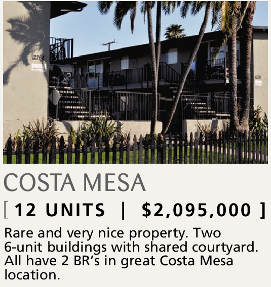 Rare and very nice property. Two 6-unit buildings with shared courtyard. All have 2 BR’s in great Costa Mesa location.