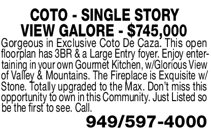 COTO - SINGLE STORY VIEW GALORE - $745,000 Gorgeous in Exclusive Coto De Caza. This open floorplan has 3BR & a Large Entry foyer. Enjoy entertaining in your own Gourmet Kitchen, w/Glorious View of Valley & Mountains. The Fireplace is Exquisite w/ Stone. Totally upgraded to the Max. Don’t miss this opportunity to own in this Community. Just Listed so be the first to see. Call. 949/597-4000