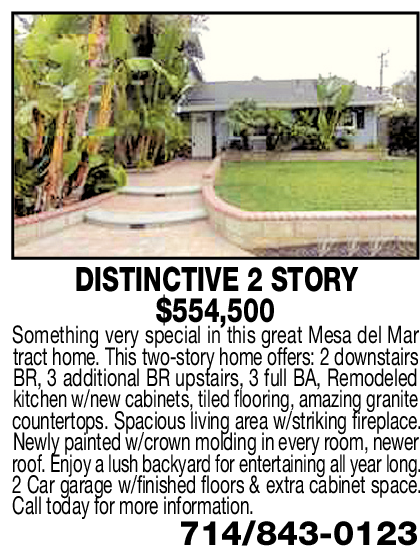 DISTINCTIVE 2 STORY $554,500 Something very special in this great Mesa del Mar tract home. This two-story home offers: 2 downstairs BR, 3 additional BR upstairs, 3 full BA, Remodeled kitchen w/new cabinets, tiled flooring, amazing granite countertops. Spacious living area w/striking fireplace. Newly painted w/crown molding in every room, newer roof. Enjoy a lush backyard for entertaining all year long. 2 Car garage w/finished floors & extra cabinet space. Call today for more information. 714/843-0123 See also