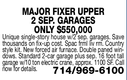 MAJOR FIXER UPPER 2 SEP. GARAGES ONLY $550,000 Unique single-story house w/2 sep. garages. Save thousands on fix-up cost. Spac frml liv rm. Country style kit. New forced air furnace. Double paned windows. Standard 2-car garage plus sep. 16 foot tall garage w/10 ton electric crane, approx. 1100 SF. Call now for details. 714/969-6100