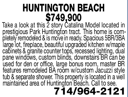 HUNTINGTON BEACH $749,900 Take a look at this 2 story Catalina Model located in prestigious Park Huntington tract. This home is completely remodeled & is move in ready. Spacious 5BR/3BA large lot, fireplace, beautiful upgraded kitchen w/maple cabinets & granite counter tops, recessed lighting, dual pane windows, custom blinds, downstairs BR can be used for den or office, large bonus room, master BR features remodeled BA room w/custom Jacuzzi style tub & separate shower. This property is located in a well maintained area of Huntington Beach. Call to see. 714/964-2121 See also