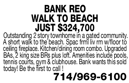 BANK REO WALK TO BEACH JUST $324,700 Outstanding 2 story townhome in a gated community. A short walk to the beach. Spac frml liv rm w/floor to ceiling fireplace. Kitchen/dining room combo. Upgraded BAs, 2 king size BRs plus loft. Amenities include pools, tennis courts, gym & clubhouse. Bank wants this sold today! Be the first to call ! 714/969-6100 See also