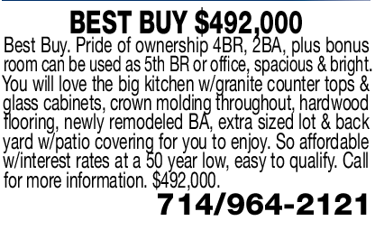 BEST BUY $492,000 Best Buy. Pride of ownership 4BR, 2BA, plus bonus room can be used as 5th BR or office, spacious & bright. You will love the big kitchen w/granite counter tops & glass cabinets, crown molding throughout, hardwood flooring, newly remodeled BA, extra sized lot & back yard w/patio covering for you to enjoy. So affordable w/interest rates at a 50 year low, easy to qualify. Call for more information. $492,000. 714/964-2121 See also