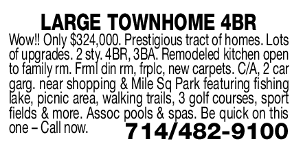 its Offered LARGE TOWNHOME 4BR Wow!! Only $324,000. Prestigious tract of homes. Lots of upgrades. 2 sty. 4BR, 3BA. Remodeled kitchen open to family rm. Frml din rm, frplc, new carpets. C/A, 2 car garg. near shopping & Mile Sq Park featuring fishing lake, picnic area, walking trails, 3 golf courses, sport fields & more. Assoc pools & spas. Be quick on this one – Call now. 714/482-9100