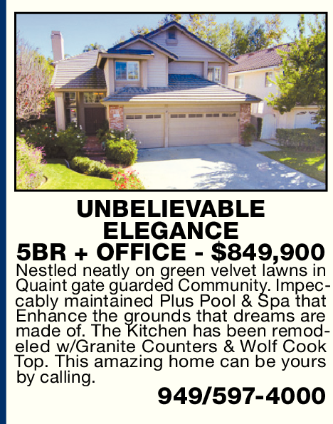 UNBELIEVABLE ELEGANCE 5BR + OFFICE - $849,900 Nestled neatly on green velvet lawns in Quaint gate guarded Community. Impeccably maintained Plus Pool & Spa that Enhance the grounds that dreams are made of. The Kitchen has been remodeled w/Granite Counters & Wolf Cook Top. This amazing home can be yours by calling. 949/597-4000 See also