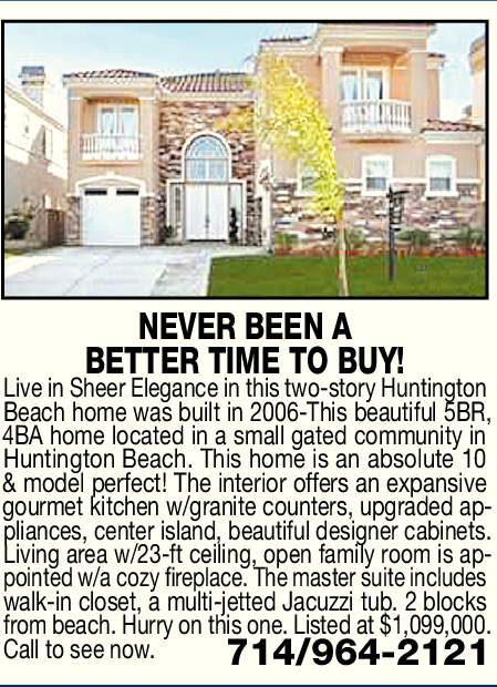 Living area w/23-ft ceiling, open family room is appointed w/a cozy fireplace. The master suite includes walk-in closet, a multi-jetted Jacuzzi tub. 2 blocks from beach. Hurry on this one. Listed at $1,099,000. Call to see now. 714/964-2121
