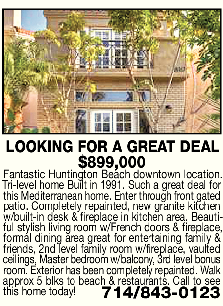 LOOKING FOR A GREAT DEAL $899,000 Fantastic Huntington Beach downtown location. Tri-level home Built in 1991. Such a great deal for this Mediterranean home. Enter through front gated patio. Completely repainted, new granite kitchen w/built-in desk & fireplace in kitchen area. Beautiful stylish living room w/French doors & fireplace, formal dining area great for entertaining family & friends, 2nd level family room w/fireplace, vaulted ceilings, Master bedroom w/balcony, 3rd level bonus room. Exterior has been completely repainted. Walk approx 5 blks to beach & restaurants. Call to see this home today! 714/843-0123